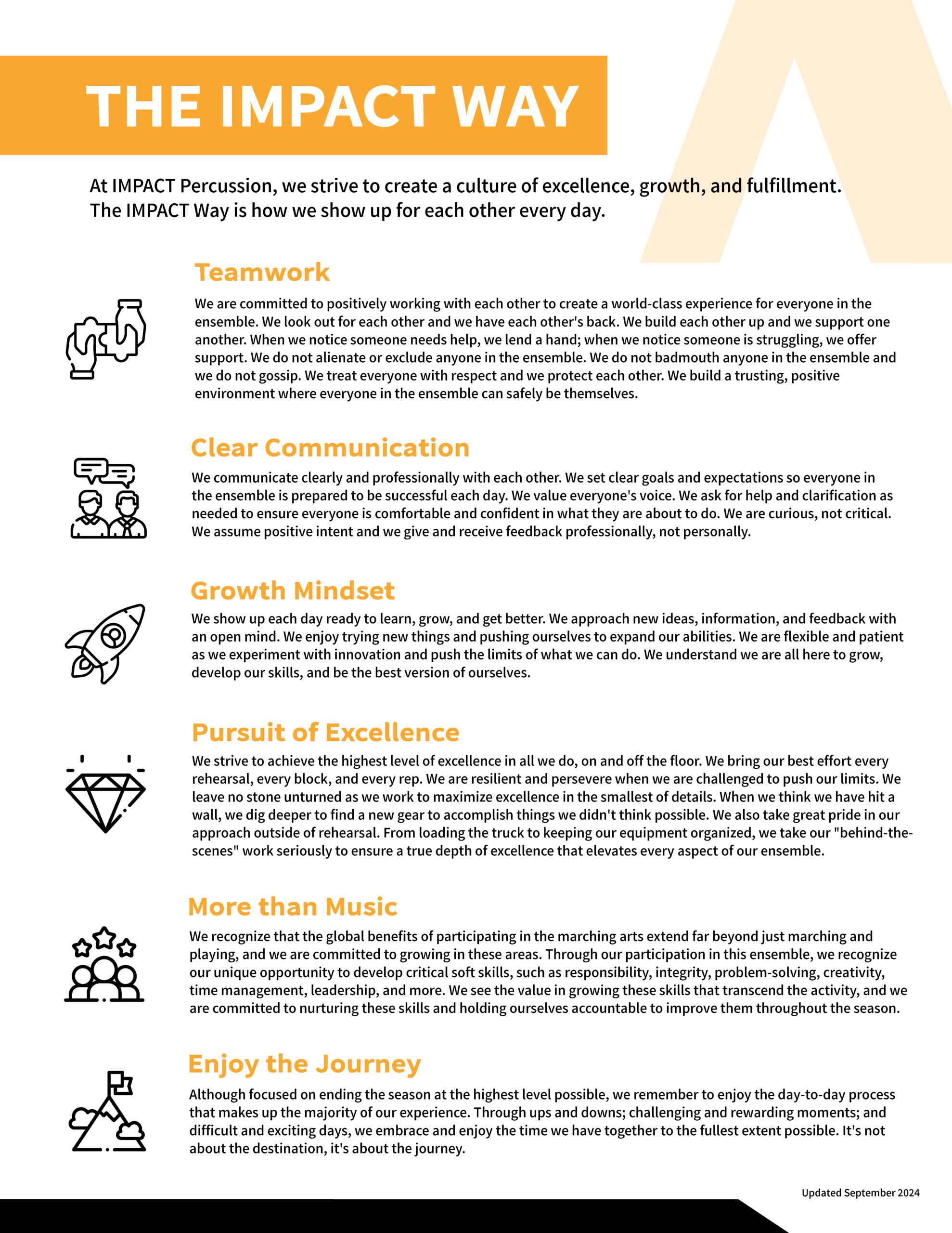 At IMPACT Percussion, we’re not just looking for excellent musicians and passionate performers; we’re looking for outstanding humans. We’re looking for people who constantly think positively and can push their limits, we’re looking for people who can build others up around them and remain humble, we’re looking for people who can take feedback and quickly make adjustments, we’re looking for people who strive for excellence on and off the floor.